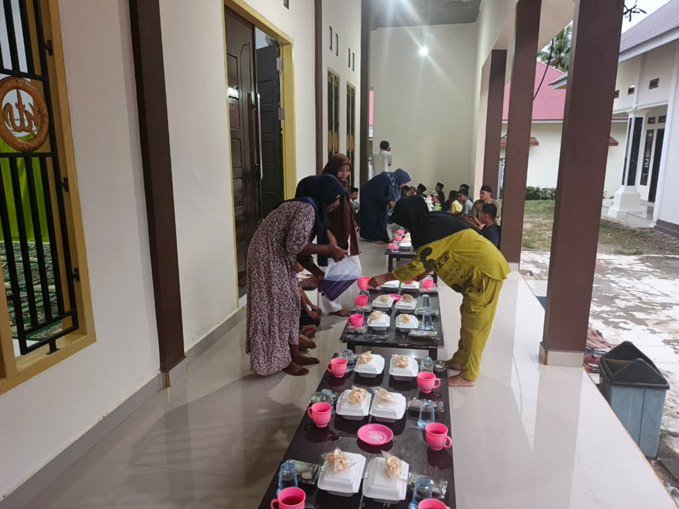 Setelah kegiatan bersih-bersih selesai, suasana kebersamaan semakin terasa ketika mahasiswa dan warga bersama-sama menyiapkan hidangan berbuka puasa. Makanan yang telah disiapkan kemudian dinikmati bersama di teras masjid dengan penuh keakraban dan kekeluargaan.