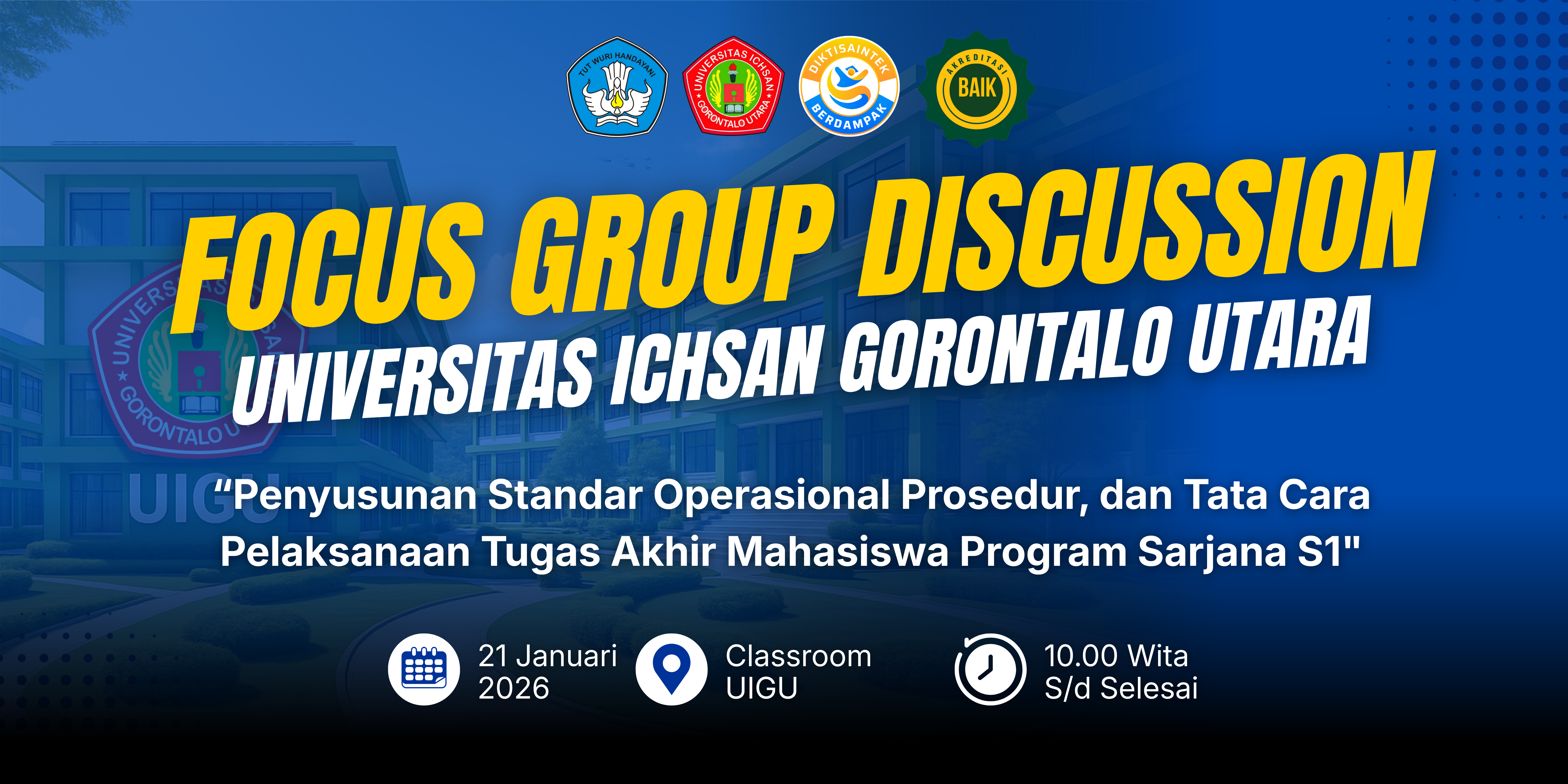 Kegiatan yang berlangsung dari pukul 10.00 WITA hingga 16.50 WITA ini dirancang secara interaktif, dengan sesi presentasi, diskusi panel, dan kerja kelompok. Setiap peserta diberi kesempatan menyampaikan masukan berdasarkan pengalaman lapangan dan tantangan yang sering dihadapi. Diharapkan dari FGD ini akan dihasilkan draf awal SOP Tugas Akhir S1 yang lebih terintegrasi, aplikatif, dan berorientasi pada kemudahan layanan akademik. Draf tersebut selanjutnya akan dibahas lebih mendalam di tingkat program studi sebelum ditetapkan sebagai pedoman resmi universitas.